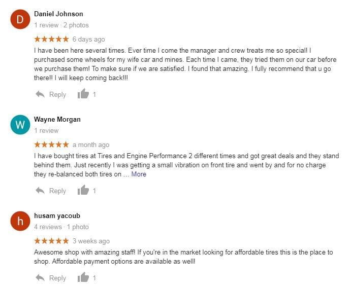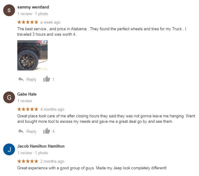" I have been here several times. Ever time I come the manager and crew treats me so special! I purchased some wheels for my wife car and mines. Each time I came, they tried them on our car before we purchase them! To make sure if we are satisfied. I found that amazing. I fully recommend that u go there!! I will keep coming back!!! "